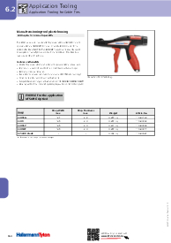 | Application | The EVO9 is available in a standard grip span 90 mm (EVO9) or short grip span 80 mm (EVO9SP), for smaller hands. Both tools perform between 53 N and 307 N. The EVO9HT (high tension) was designed to apply HellermannTyton cable ties from 120 N until 516 N with a maximum width of 13.5 mm. |