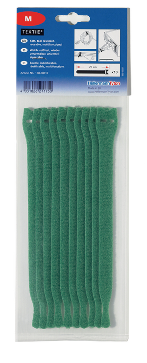 | Application | The TEXTIE-Series offers a soft bundling method and is ideal for use on telephone cables, optical fibre and network cables. These cable ties can be reopened and reused up to 400 times. A perfect solution for temporary installations and cable management for stage equipment, at outdoor events or for prototype harnessing. Also suitable for use in private or office applications. TEXTIE cable ties are available in various colours and can be used to colour-code cables and/or wires. |