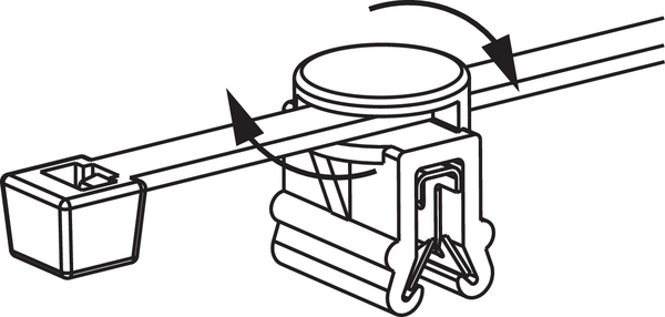 These EdgeClips are also mounted simply by pushing them onto an edge. A twistable EdgeClip is the ideal solution whenever flexible routing of cable bundles is required. The cable route can even be modified post-installation. The clips are available in 90° and 360° models for use with different types of cable tie. On the CBT30MR the bundle runs at the side of the clip, on the CBTO50R it runs over the centre of the clip. |