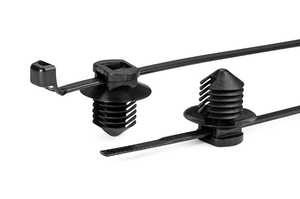 These two-piece fixings are supplied ready assembled and offer a simple and versatile method of bundling and fixing cables. The fir-tree base will easily push into pre-punched holes in panels or threaded, blind, holes and offers a very secure fixing. The two-piece design enables the head of the tie to be orientated to the required position to ease assembly, whilst the 'disc' on the top of the fir tree covers the hole and minimises the ingress of water and dirt. |