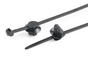 These two-piece fixings are supplied ready assembled and offer a simple and versatile method of bundling and fixing cables. The fir-tree base will easily push into pre-punched holes in panels or threaded, blind, holes and offers a very secure fixing. The two-piece design enables the head of the tie to be orientated to the required position to ease assembly, whilst the 'disc' on the top of the fir tree covers the hole and minimises the ingress of water and dirt. |