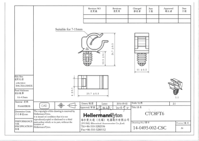 | Short Description | Convoluted Tubing Clip, round holes 6.1 - 6.9 mm/6.35 mm (hexagonal), fir tree, high impact modified, heat stabilised, black |