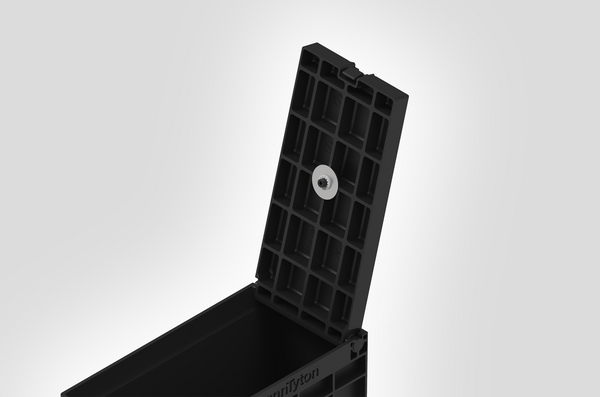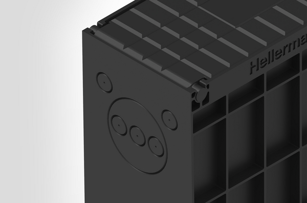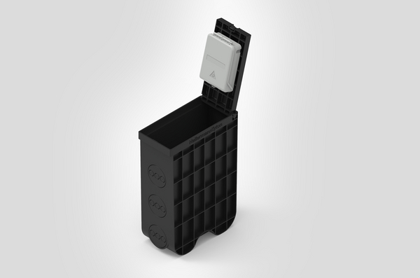 The TobyBox300 has been designed by HellermannTyton with a mounting point for the Customer Entry Point (CEP) Enclosure. The hinged lid opens up to a 105˚ angle for easy access and should be installed to open towards the customer home. If some resurface work occurs and buries the tobybox, a metal detector can be used to detect it, as a metal washer has been fitted within the lid. A Torx security screw prevents from vandalism. Each side features knock out circles for two different size ducts: 14mm diameter or 54mm diameter. A drainage hole can be drilled at the base to evacuate excess water. The TobyBox300 is manufactured from non-slip black polypropylene and is 100% recyclable. This is a lightweight underground access chamber, easy to install with a ribbed design for strength. A 67mm x 35mm inset position on the front lid allows for a customer logo to be moulded. It has been tested to BS 5834-2-2011 Class to sustain a 5kN load and its installation should be in compliance with local rules and guidance. |