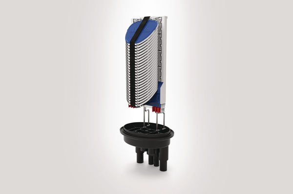 The FDN 59 Port Integrated Routing (IR) B Length closure is supplied with a Polypropylene base. The base configuration of 58 round ports and 1 oval port covers a cable diameter range of 1.7 – 29.0mm when using Cablelok mechanical seals and 6.0 – 35.0mm when using heatshrink. The mounting system is manufactured from Grade 304 stainless steel and the backplane is an aluminium extrusion which manages 24 SE-IR MKII 3A splice trays. The position of the mounting system allows easy access for the routing of the fibre on to the trays. The trays and fibre optic routing module are white which makes it easy to see the colour of the fibre elements as they are routed through the positive fibre management system. Fibre slot retaining blocks guide fibre elements in to the IR system, the foam pad on the retainer is partially cut through to accommodate a range of fibre counts. All IR system cover plates are coloured blue identifying them as removable parts allowing access to the fibre, the fibre slot retaining block and tray retaining clips are coloured red to aid in identification if they are dropped. |