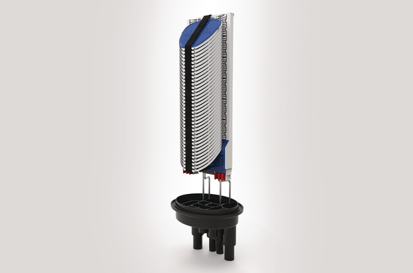 The FDN 59 Port Integrated Routing (IR) C Length closure is supplied with a Polypropylene base. The base configuration of 58 round ports and 1 oval port covers a cable diameter range of 1.7 – 29.0mm when using Cablelok mechanical seals and 6.0 – 35.0mm when using heatshrink. The mounting system is manufactured from Grade 304 stainless steel and the backplane is an aluminium extrusion which manages 36 SE-IR MKII trays fitted with 3A splice bridges. The position of the mounting system allows easy access for the routing of the fibre on to the trays. The trays and fibre optic routing module are white which makes it easy to see the colour of the fibre elements as they are routed through the positive fibre management system. Fibre slot retaining blocks guide fibre elements in to the IR system, the foam pad on the retainer is partially cut through to accommodate a range of fibre counts. All IR system cover plates are coloured blue identifying them as removable parts allowing access to the fibre, the fibre slot retaining block and tray retaining clips are coloured red to aid in identification if they are dropped. |