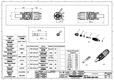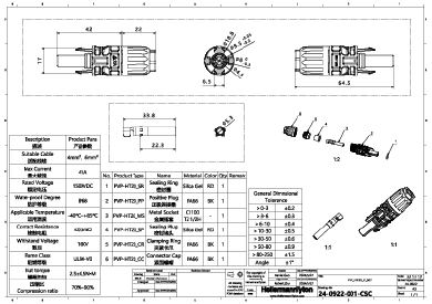 | Application | PVP-HT20 connectors offer quality connections for the photovoltaic industry. It uses high quality materials that guarantee long-term reliability, lower contact resistance and higher current transfer capability to ensure high product efficiency. |