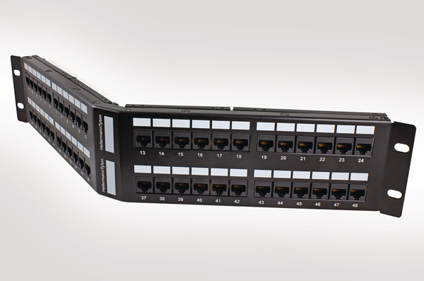 The Universal 110 Angled Category 6 range of panels offer exceptional performance and are available in 1U 24 port and 2U 48 port configurations. The 2U 48 Port Angled Panel is constructed of 8 modular units, each offering 6 RJ45 ports allowing for any of the 6 port modules to be replaced in the case of damage or failure. The angled design of the panel removes the need for the use of front cable management increasing capacity by up to 50%. The Universal 110 2U 48 Port Angled Patch Panel is supplied with Rack Snap, Cage Nut or 12-24 rack screw fixings and an optional rear cable manager is available. The Universal 110 Angled Category 6 products are designed to support any data or voice protocol that is capable of running over a Category 6 cabling system. |