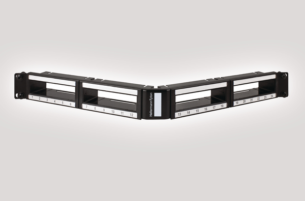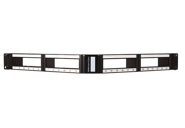 The 1U 24 port panel accommodates four 6 port short body Category 6A, Category 6, Category 5e cassettes and the full range of Fibre Fanout Modules. The angled design of the panel removes the need for the use of front cable management increasing capacity by up to 50%. The panel offers dual labelling for each cassette and a central labelling for U identification. The RapidNet short body cassettes and fibre fanout modules simply push into the panels, snapping in with a push down clip. A fully loaded panel presents 24 Category 6A, Categroy 6 or Category 5e RJ45 ports. An optional rear cable manager is also available. |