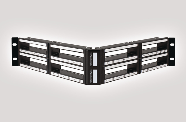 The 2U 48 port panel accommodates eight 6 port short body Category 6A, Category 6, Category 5e cassettes and the full range of Fibre Fanout Modules. The angled design of the panel removes the need for the use of front cable management increasing capacity by up to 50%. The panel offers dual labelling for each cassette and a central labelling for U identification. The RapidNet short body cassettes and fibre fanout modules simply push into the panels, snapping in with a push down clip. A fully loaded panel presents 48 Category 6A, Categroy 6 or Category 5e RJ45 ports. An optional rear cable manager is also available. |