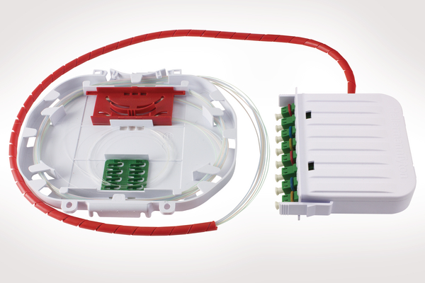 | Technical Description | The splitter assembly consists of a pre-assembled fibre splice tray with a single pre-installed 1 x 8 splitter and 1 3A splice bridge. The splitter is pre-connectorised with 8 LC Simplex 900µm output fibres. These are routed to an 8 port LC Simplex drop patch module and connected to 8 LC Simplex adaptors. |