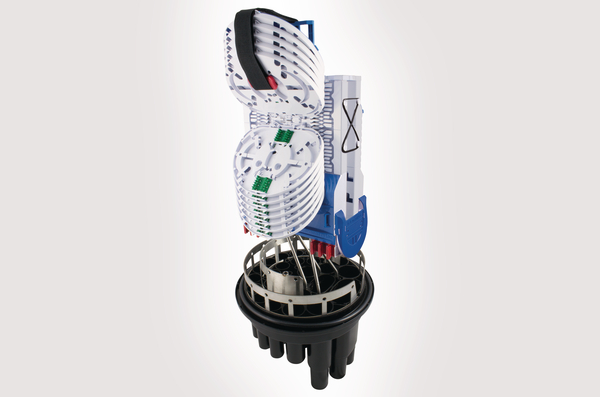 The UFC Integrated Routing (IR) B Length Double Stacked closure is available with a Cablelok (Polypropylene) or Heatshrink (Flame Retardant Polypropylene) base. The base configuration of 28 round ports and 2 oval ports covers a cable diameter range of 4.0 – 29.0mm when using Cablelok mechanical seals and 6.0 – 35.0mm when using heatshrink. The mounting system is manufactured from Grade 304 stainless steel and the backplanes are aluminium extrusions which can accommodate up to 24 IR SE trays or 48 IR SC/SC-B trays or a combination of SE, SC and SC-B trays. The position of the mounting system allows easy access for the routing of the fibre on to the trays and provides storage space between the two backplanes for the storage of fibre loops. The trays and fibre optic routing module are white which makes it easy to see the colour of the fibre elements as they are routed through the positive fibre management system. Fibre slot retaining blocks guide fibre elements in to the IR system, the foam pad on the retainer is partially cut through to accommodate a range of fibre counts. All IR system cover plates are coloured blue identifying them as removable parts allowing access to the fibre and the fibre slot retaining block and tray retaining clips are coloured red to aid in identification if they are dropped. |